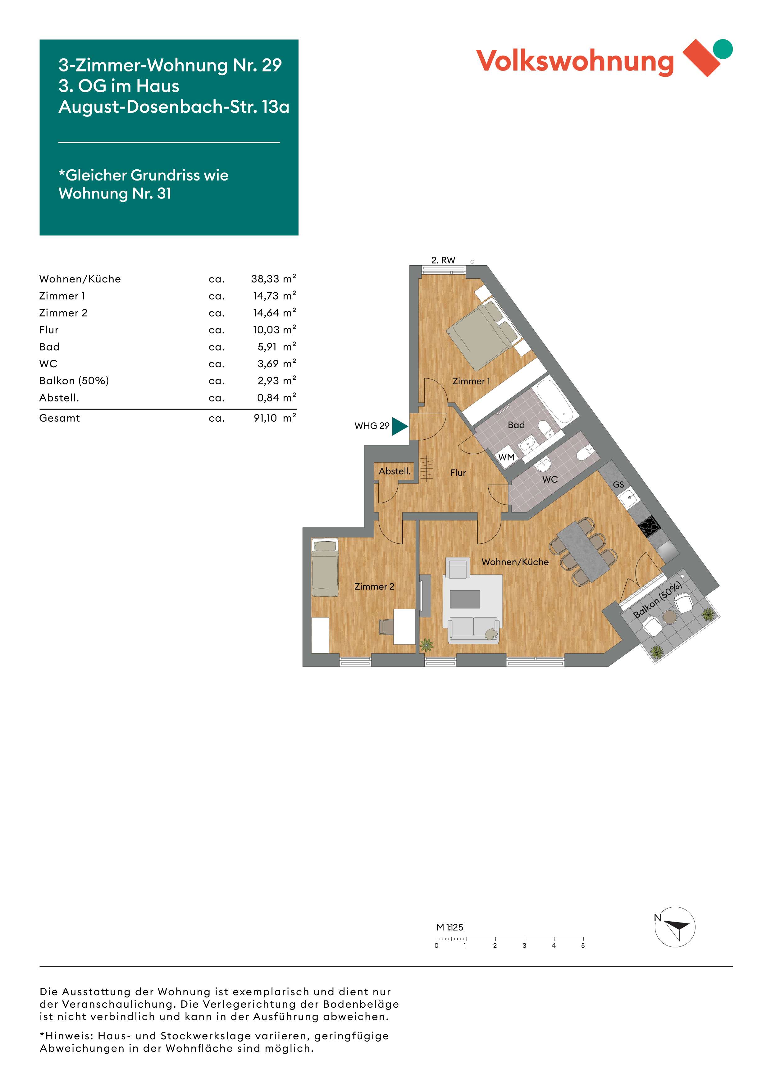 Insgesamt stehen in der August-Dosenbach-Straße 13a und 13b eine Zwei-, 3 Drei- und 11 Vier-Zimmer-Wohnungen von ca. 73 m² bis 93 m². Die Mietwohnung im Erdgeschoss hat eine Terrasse mit Gartenanteil. Die weiteren Mietwohnungen haben einen Balkon.
